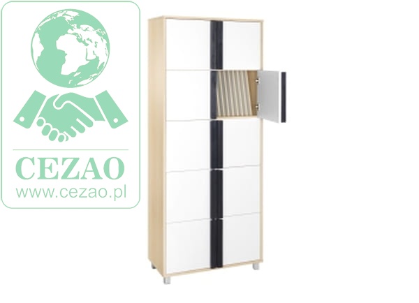 Fronty regału wykonanao z białej płyty, natomiast korpus występuje w kolorach: buk, olcha, klon, modrzew.