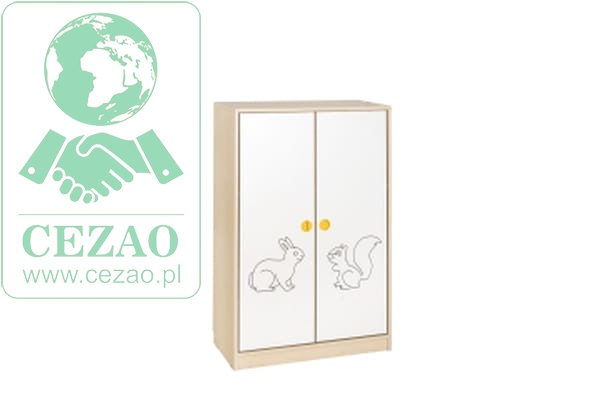 Fronty regału wykonane z białej płyty MDF, ozdobionej frezowanymi motywami zwierząt.