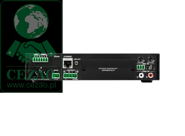 Zainstalowanie (oferowanego osobno) opcjonalnego modularnego interfejsu sieci audio Dante™ ANI44XT stwarza możliwość udostępniania muzyki z zainstalowanego modułu SourceCon™ lub sygnału ze źródła podłączonego do wejścia liniowego innym kompatybilnym urządzeniom lub wzmacniaczom w całej lokalnej sieci Dante™. Co więcej, korzystając z sieci Dante™, można odtwarzać komunikaty priorytetowe z niemal zerową latencją (100 ms).