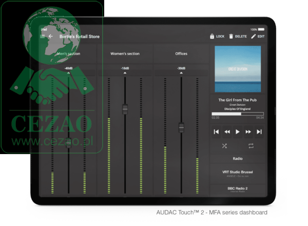 *Narzędzie do automatyzacji: ponieważ wzmacniacze serii MFA nie są wyposażone we wbudowane przekaźniki, aplikacja AUDAC Touch™ pozwala wysyłać polecenia wyłącznie do innych produktów korzystających z protokołu TCP-IP. Komunikacja dwukierunkowa między urządzeniami nie jest możliwa.