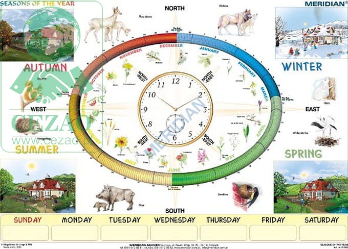 Odmierzanie czasu przy pomocy zegara z możliwością odniesienia do wizualizowanego, kalendarza, to praktyczna podstawa do ukazania cykliczności zmian zachodzących w przyrodzie. Naniesienie stron świata przygotowuje do późniejszej pracy z mapą - uczy orientacji. Rośliny, charakterystyczne dla danej pory roku, wizualizują wewnętrzną stronę kalendarza, rysunki zwierząt wzmacniają efekt wizualizacji po jego zewnętrznej stronie. W narożnikach - awers planszy - umieszczone zostały scenki z życia człowieka, specjalnie wymodelowane pod kątem pór roku. Wiosna, lato, jesień, zima podpatrzone w wiejskim domku z mnóstwem szczegółów, to przebogata a co najważniejsze gotowa scenografia do wielu tematów !