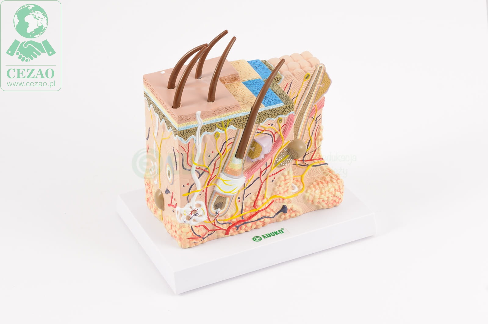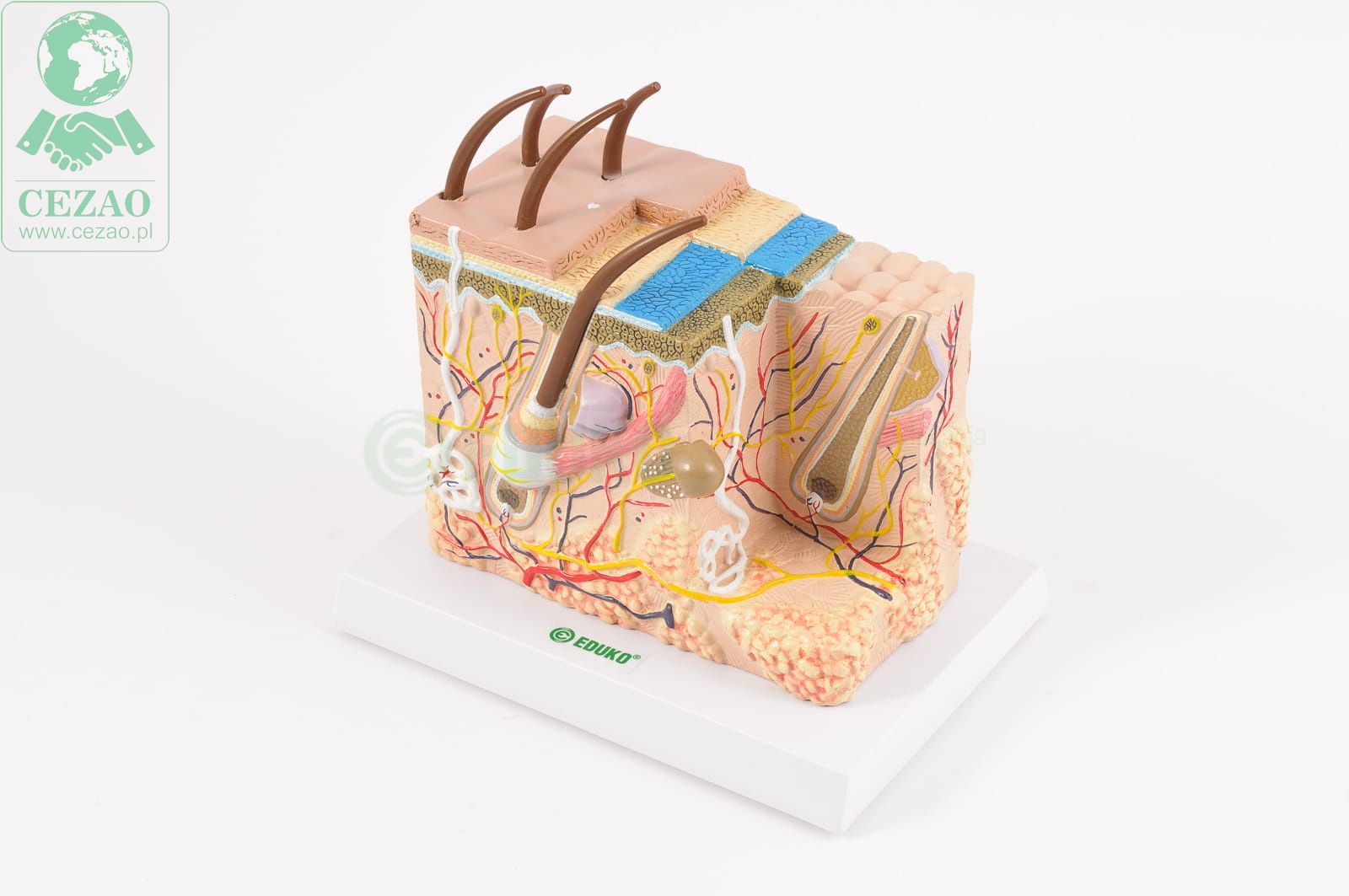 Model firmy EDUKO przedstawia przekrój skóry widzianej w znacznym powiększeniu. Dzięki trójwymiarowemu ujęciu przekroju i znacznej szczegółowości modelu doskonale widoczna jest nie tylko warstwowa, ogólna budowa skóry (naskórek, skóra właściwa, tkanka podskórna) ale też liczne wytwory skóry m.in.elementy budowy włosa wraz z mieszkiem włosowym i gruczołami łojowymi, gruczoły potowe, receptory, nerwy, naczynia krwionośne.