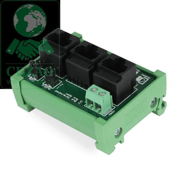 W skład zestawu wchodzą dwa wpinane terminatory, przy czym pary przeznaczone do łączności (styki 4 i 5) oraz transmisji sygnału audio (styki 7 i 8) można zakończyć ich właściwą impedancją (120 ) w celu zagwarantowania czystego sygnału audio bez odbić. Skrzynka zawiera złącze skręcane. Należy pamiętać, że zasilanie zewnętrzne (+24 VDC) można podłączyć do magistrali. Napięcie +24 V DC jest dostępne na styku 3 (+) i 6 (GND). Łatwą instalację na szynach Mini DIN umożliwia plastikowa obudowa z niepękającego tworzywa.