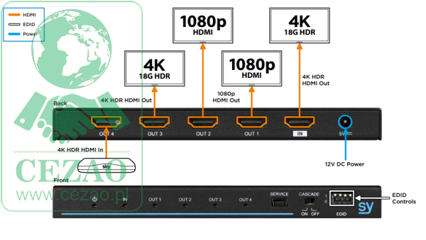 Automatyczny skaler w dół - Każde wyjście HDMI jest niezależnie zdolne do automatycznego skalowania w dół z 4K do 1080P, zapewniając, że mieszanka wyświetlaczy / projektorów 4K i 1080p może być podłączona do różnych wyjść, bez potrzeby stosowania dodatkowego sprzętu do skalowania.