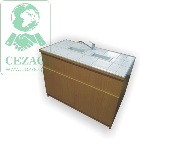 Stolik laboratoryjny wynonany na konstrukcji płyta wiórowej laminowanej 18mm, wyposażony w blat pokryty płytkami ceramicznymi kwasoodpornymi, dwa małe zlewy, zawór wodny, 2 drzwiczek. Stolik dostępny w kolorach biały, popiel, buk. Dodatkowe kolory na specjalne zamówienie.