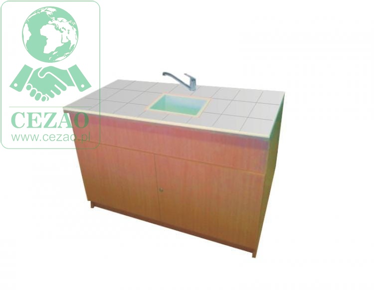 Stolik laboratoryjny wykonany na konstrukcji płyta wiórowej laminowanej 18 mm, wyposażony w blat pokryty płytkami ceramicznymi kwasoodpornymi, zlew, zawór wodny, 2 szuflady, drzwiczki, jeden duży zlew. Stolik dostępny w kolorach biały, popiel, buk. Dodatkowe kolory na specjalne zamówienie.