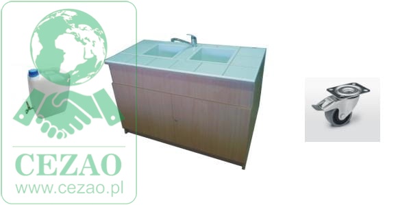 Stolik laboratoryjny wynonany na konstrukcji płyta wiórowej laminowanej 18mm, wyposażony w blat pokryty płytkami ceramicznymi, dwa duże zlewy, zawór wodny, 2 drzwiczek. Stolik dostępny w kolorach biały, popiel, buk. Dodatkowe kolory na specjalne zamówienie. Stolik posiada w wyposażeniu dwa zbiorniki na wodę czystą i ścieki 20l każdy, pompe wodną 24V, włącznik pompy na panelu zewnętrznym stolika, gniazdko elektryczne, kółka obrotowe z hamulcem.