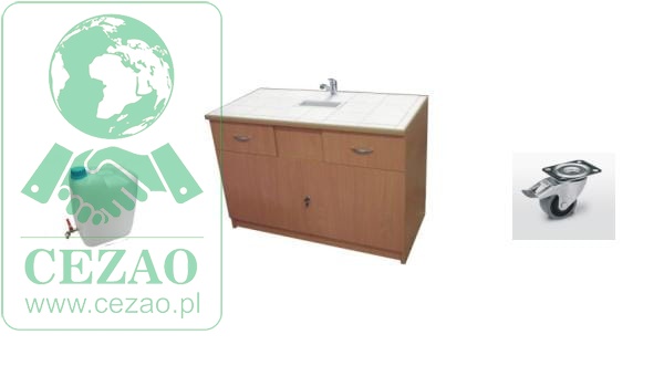 Stolik laboratoryjny wykonany na konstrukcji płyta wiórowej laminowanej 18mm, wyposażony w blat pokryty płytkami ceramicznymi, zlew, zawór wodny, 2 szuflady, drzwiczki. Stolik dostępny w kolorach biały, popiel, buk. Dodatkowe kolory na specjalne zamówienie. Stolik posiada w wyposażeniu dwa zbiorniki na wodę czystą i ścieki 20l każdy, pompe wodną 24V, włącznik pompy na panelu zewnętrznym stolika, gniazdko elektryczne, kółka obrotowe z hamulcem.