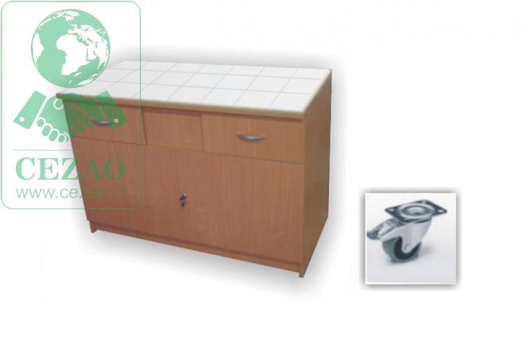 Stolik laboratoryjny wynonany na konstrukcji płyta wiórowej laminowanej 18mm, wyposażony w blat pokryty płytkami ceramicznymi, 2 szuflady, drzwiczki. Stolik dostępny w kolorach biały, popiel, buk. Dodatkowe kolory na specjalne zamówienie. Stolik wyposażony jest w kółka obrotowe z hamulcem.