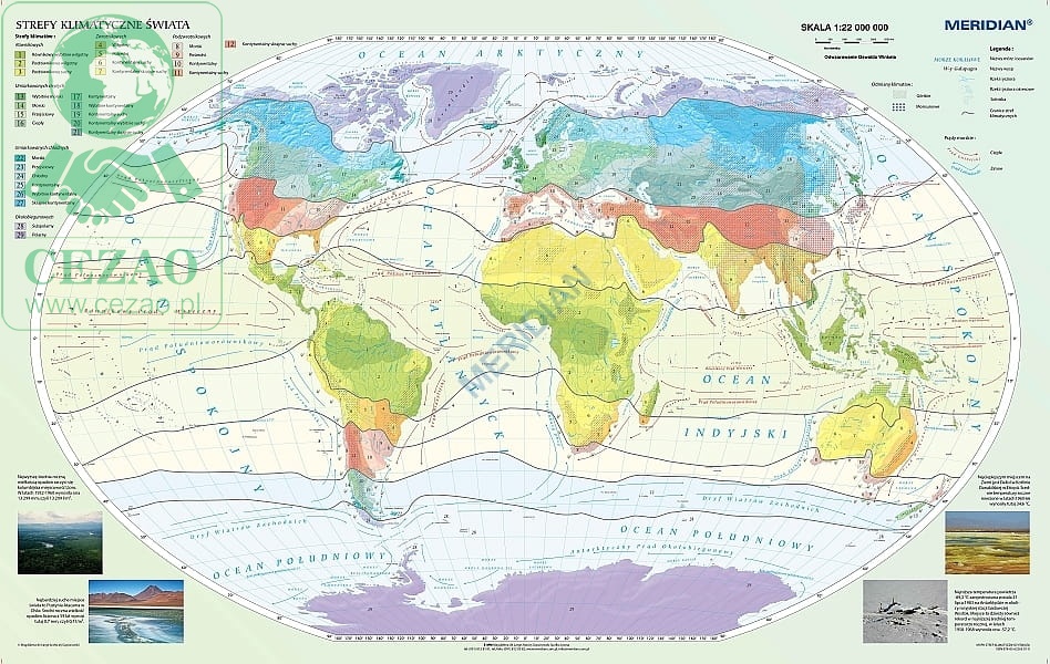 Ścienna mapa szkolna przedstawiająca strefową klasyfikację klimatów wg Wincentego Okołowicza oraz podział na 29 typów klimatów w obrębie tych stref. Dodatkowo uwzględnione zostały astrefowe odmiany klimatów: górskie i monsunowe, a także istotne regulatory klimatu światowego czyli prądy morskie, z podziałem na ciepłe i zimne, stałe i okresowe. Na mapie zaznaczone są także zasięgi występowania raf koralowych oraz lasów brunatnic.