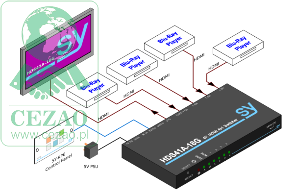 Wejścia i wyjścia - HDS41A-18G posiada cztery wejścia HDMI 2.0 18G i jedno wyjście HDMI 2.0 18G.
