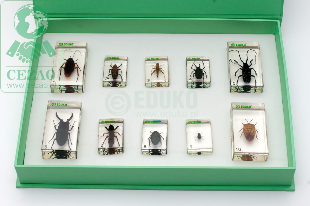 Zestaw zawiera 10 okazów owadów, które ze względu na powodowane podczas żerowania straty w prowadzonych przez człowieka uprawach bądź uciążliwość sąsiedztwa zwykło się nazywać szkodnikami. Zatopione w przejrzystej i trwałej pleksi preparaty można wyjąć z estetycznego pudełka do bliższych oględzin dzięki czemu zestaw jest nie tylko ładny ale i praktyczny. Ten ciekawy zestaw odpowiednio dobranych przedstawicieli świata owadów urozmaici lekcje przyrody bądź biologi i pomoże sprowokować dyskusje nad znaczeniem owadów w gospodarce człowieka.