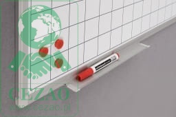Tablica biała suchościeralna z powierzchnią lakierowaną o właściwościach magnetycznych. Stały nadruk: kratka (5 x 5 cm). Rama wykonana z profilu aluminiowego UKF w kolorze srebrnym, wykończona eleganckimi, popielatymi narożnikami. Tył tablicy wzmocniono blachą ocynkowaną, aby zapewnić jej stabilność, chroniąc przed wilgocią oraz wyginaniem. Dodatkowo produkt posiada wygodną półkę, która zmieści wszelkiego rodzaju przybory niezbędne podczas prezentacji. Wyjątkowo łatwa i szybka w montażu.