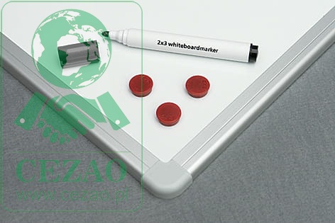Powierzchnia ceramiczna (suchościeralna - magnetyczna), rama z profilu aluminiowego anodowana na kolor srebrny, plastikowe narożniki w kolorze popielatym, w komplecie półka na markery o długości 30 cm, marker i 3 magnesy oraz elementy mocujące.