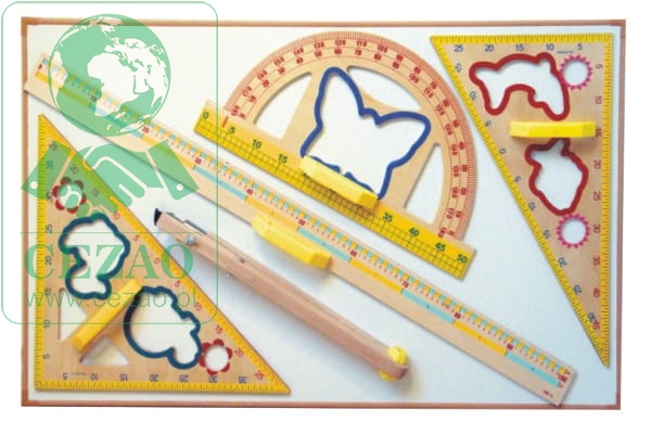 Przyrządy wykonane są ze sklejki wodoodpornej, trzykrotnie pokrytej farbą. Skala, odporna na ścieranie, naniesiona metodą sitodruku. Przyrządy posiadają wycięte ilustracje, które umożliwiają odwzorowanie kształtu na tablicy, przez co uatrakcyjniają naukę i zachęcają do częstego korzystania z nich na zajęciach.