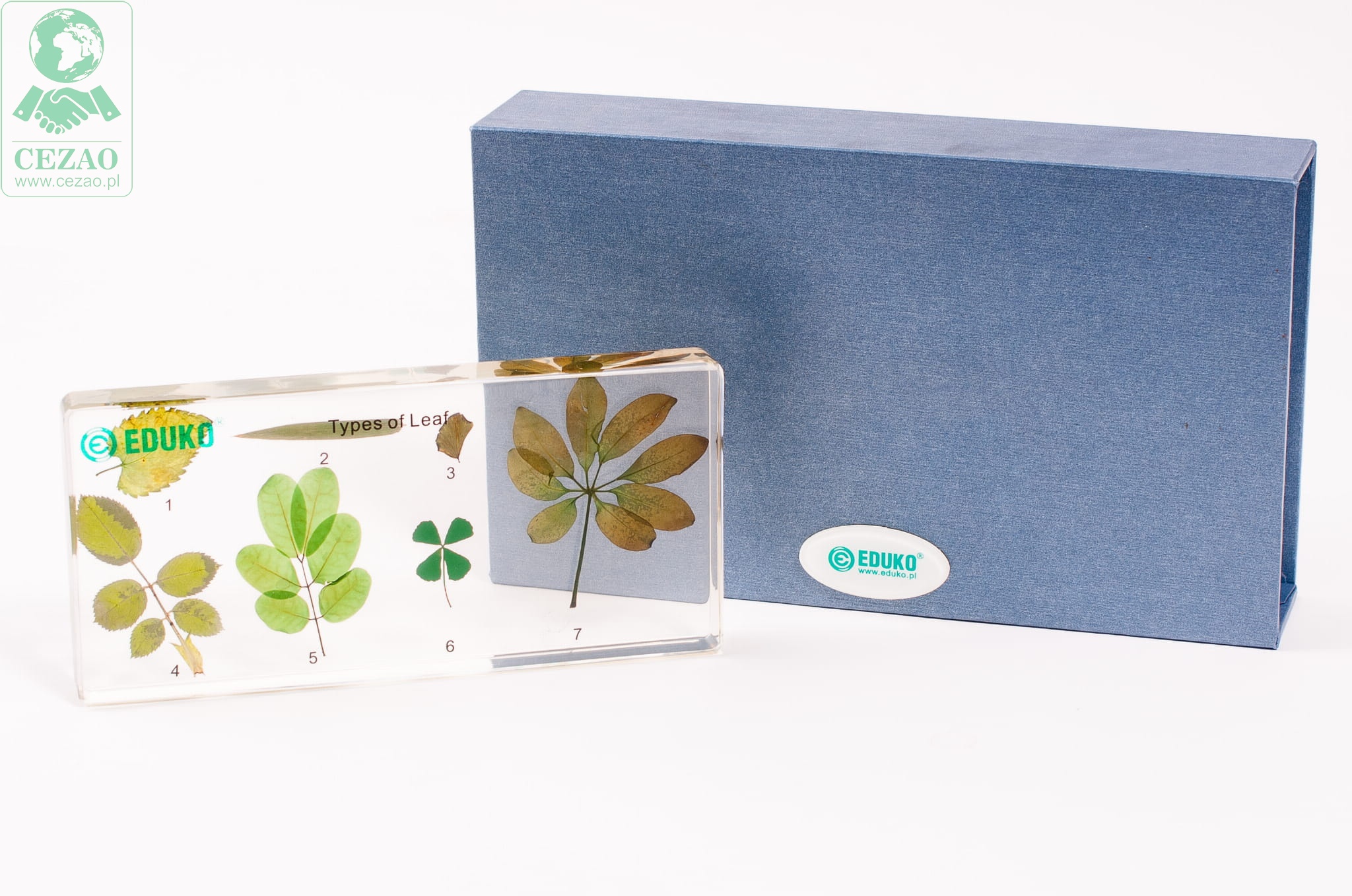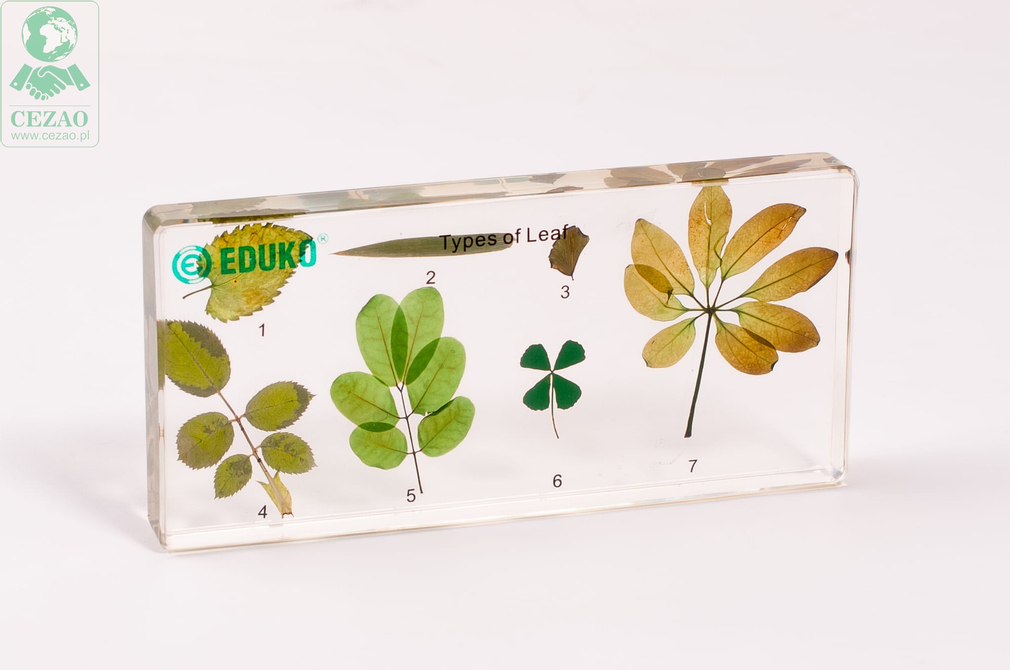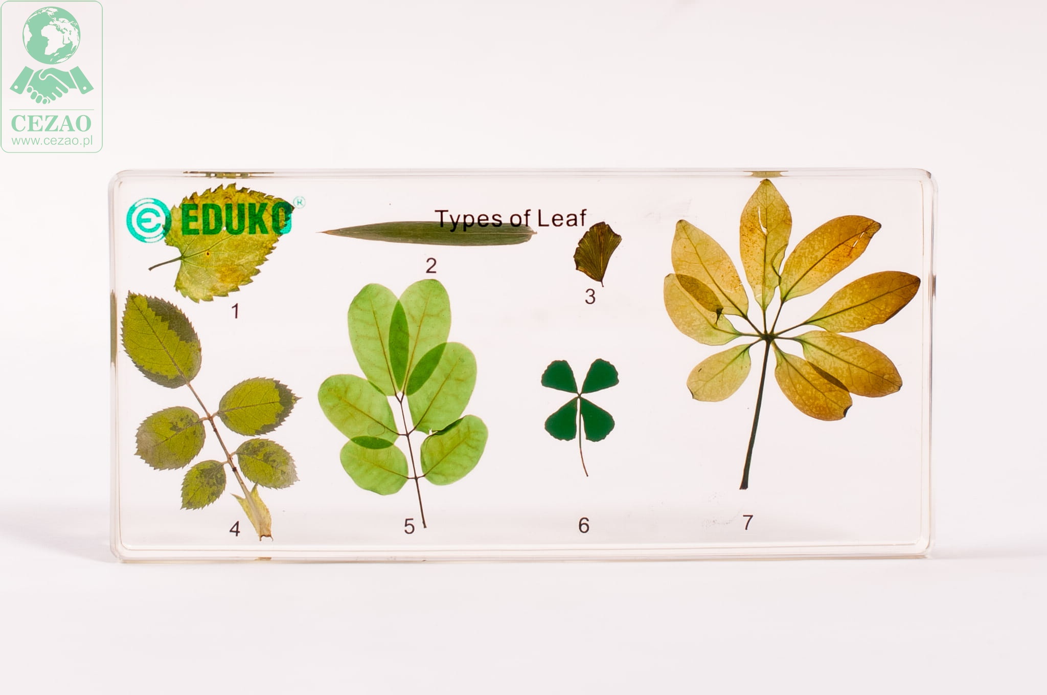 Preparat firmy EDUKO zawiera 7 okazów liści różnych rodzin zatopionych w pleksi. Jest to doskonała pomoc edukacyjna dla klas przyrodniczych i biologicznych, która umożliwia zapoznanie ucznia z różnorodnością kształtów blaszki liściowej, ich brzegów oraz nasady i szczytu liścia. Przejrzyste tworzywo, w których zalane zostały liście pozwala na wnikliwą obserwację, jest bezpieczne dla ucznia i zwiększa trwałość preparatu.