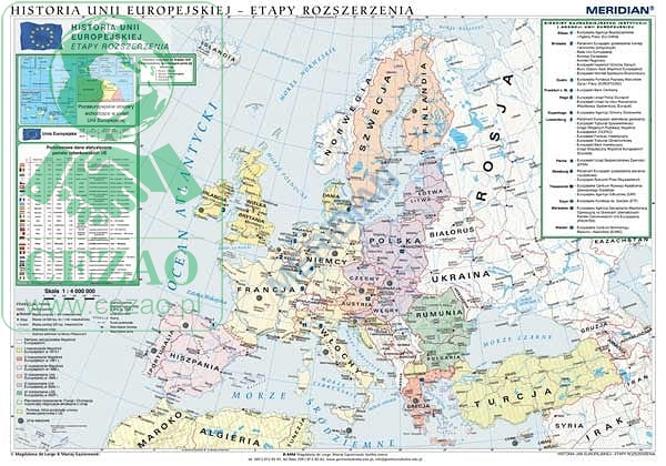 Ścienna mapa szkolna przedstawiająca kolejne etapy rozszerzania Unii Europejskiej wraz z podstawowymi danymi statystycznymi Unii oraz państw członkowskich takimi jak: powierzchnia, stolica, ludność, język, ustrój oraz jednostka monetarna. Ponad to pozaeuropejskie obszary wchodzące w skład UE, obszary należące do krajów unii, pozostające poza jej strukturą jak również siedziby najważniejszych instytucji i agencji.