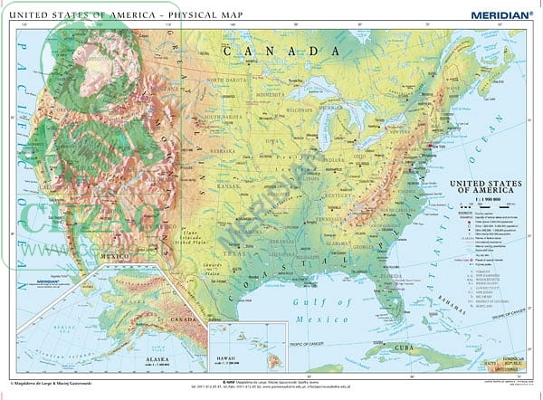 Ścienna, fizyczna mapa szkolna w języku angielskim przedstawiająca ukształtowanie powierzchni Stanów Zjednoczonych Ameryki Północnej (USA). W dolnym kartonie znajdują się dodatkowe mapki Alaski i Hawaii (skali 1 : 3 200 000).