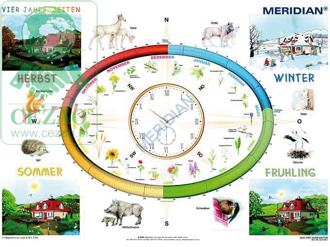 Plansza do nauczania aktywnego o sprawdzonej dydaktycznie onstrukcji chronocentrycznej. Odmierzanie czasu przy pomocy zegara z możliwością odniesienia do zwizualizowanego, kalendarza, to praktyczna podstawa do ukazania cykliczności zmian zachodzących w przyrodzie. Naniesienie stron świata przygotowuje do póĽniejszej pracy z mapą - uczy orientacji. Rośliny, charakterystyczne dla danej pory roku, wizualizują wewnętrzną stronę kalendarza, rysunki zwierząt wzmacniają efekt wizualizacji po jego zewnętrznej stronie. W narożnikach - awers planszy - umieszczone zostały scenki z życia człowieka, specjalnie wymodelowane pod kątem pór roku. Wiosna, lato, jesień, zima podpatrzone w wiejskim domku z mnóstwem szczegółów, to przebogata a co najważniejsze gotowa scenografia do wielu tematów!
