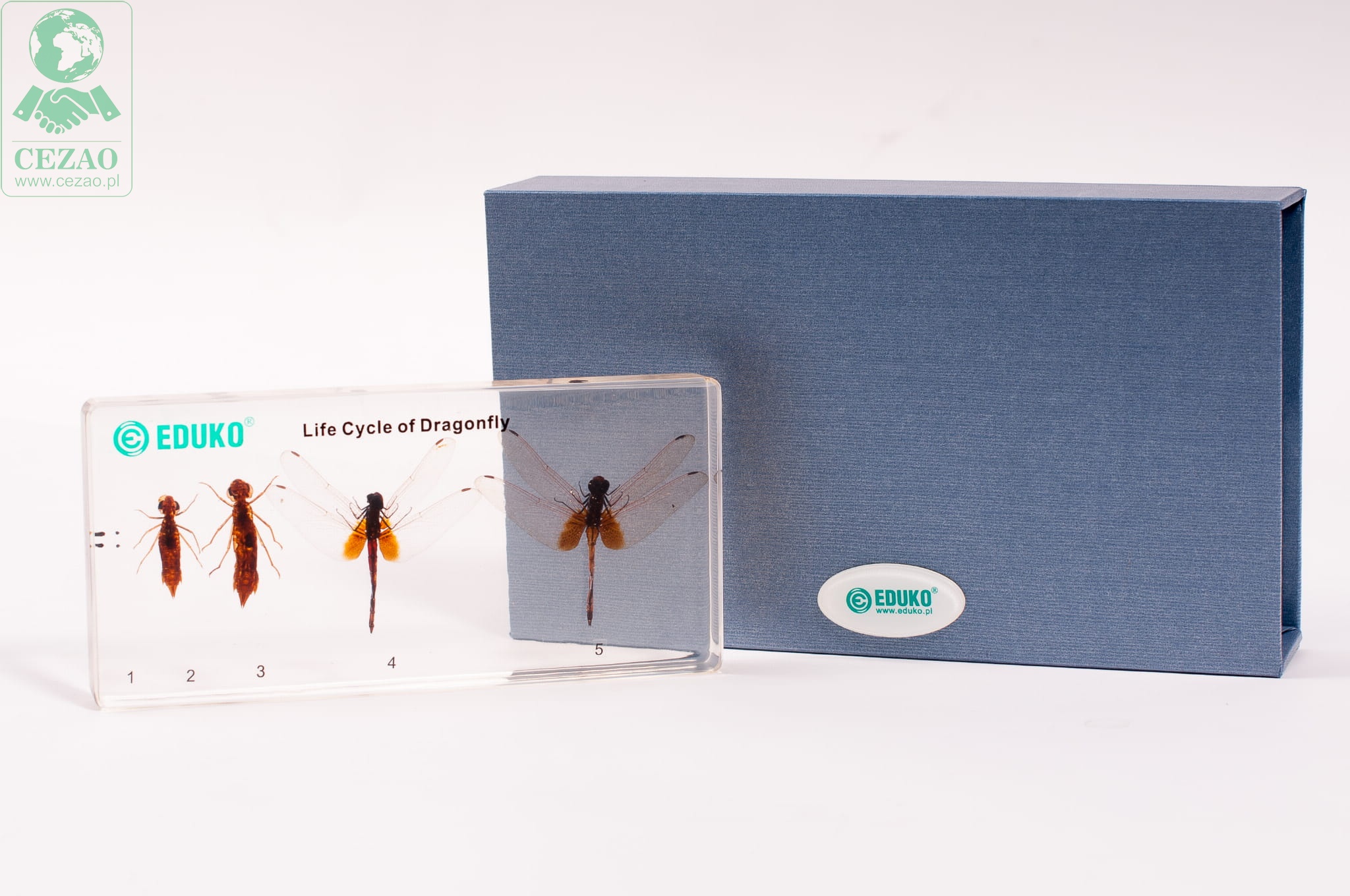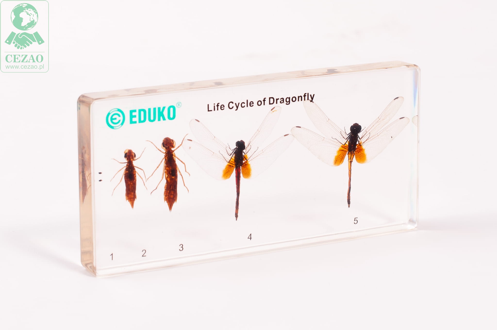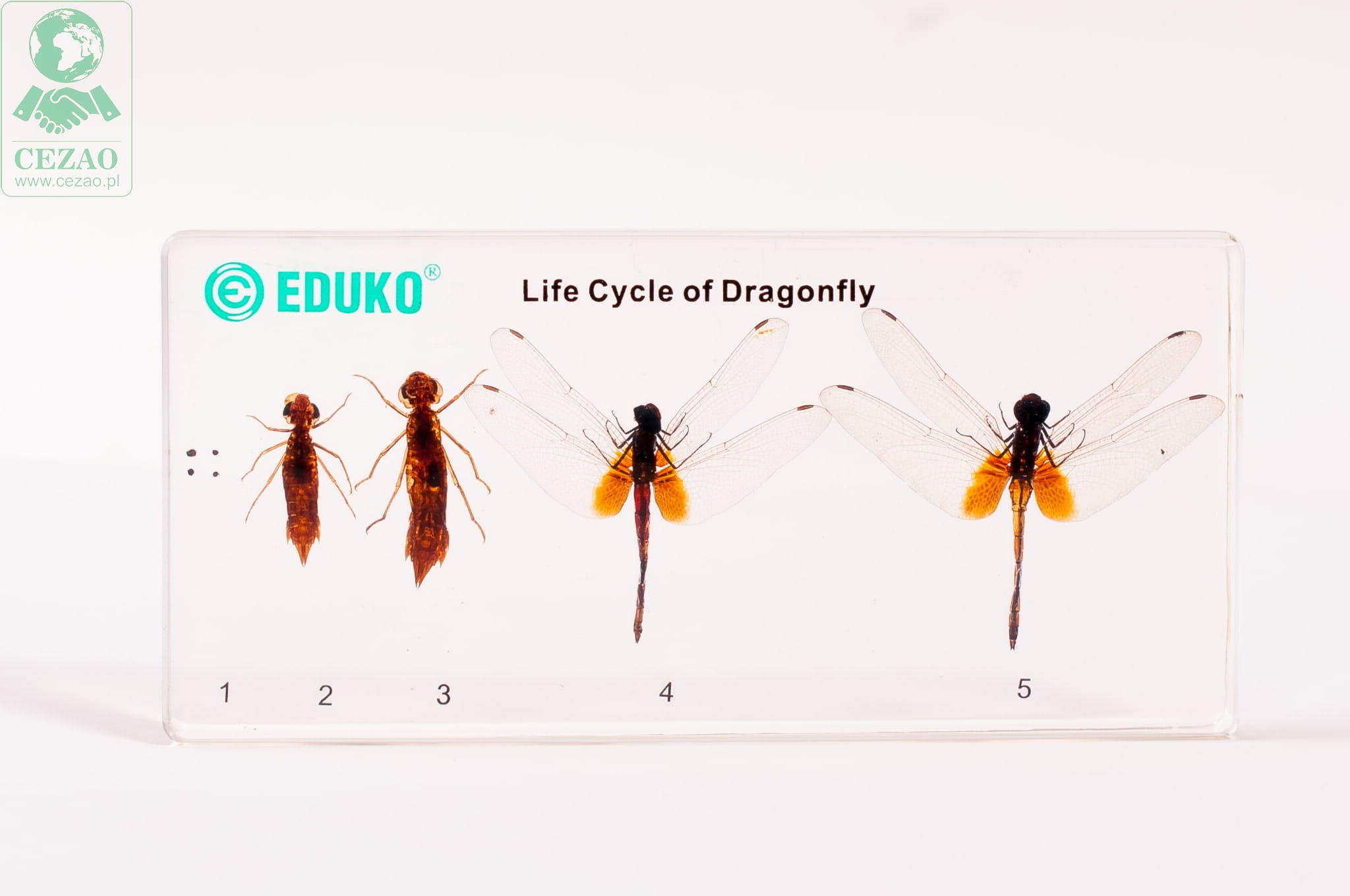 Preparat w pleksi prezentuje poszczególne etapy przeobrażenia niezupełnego owada na przykładzie ważki.