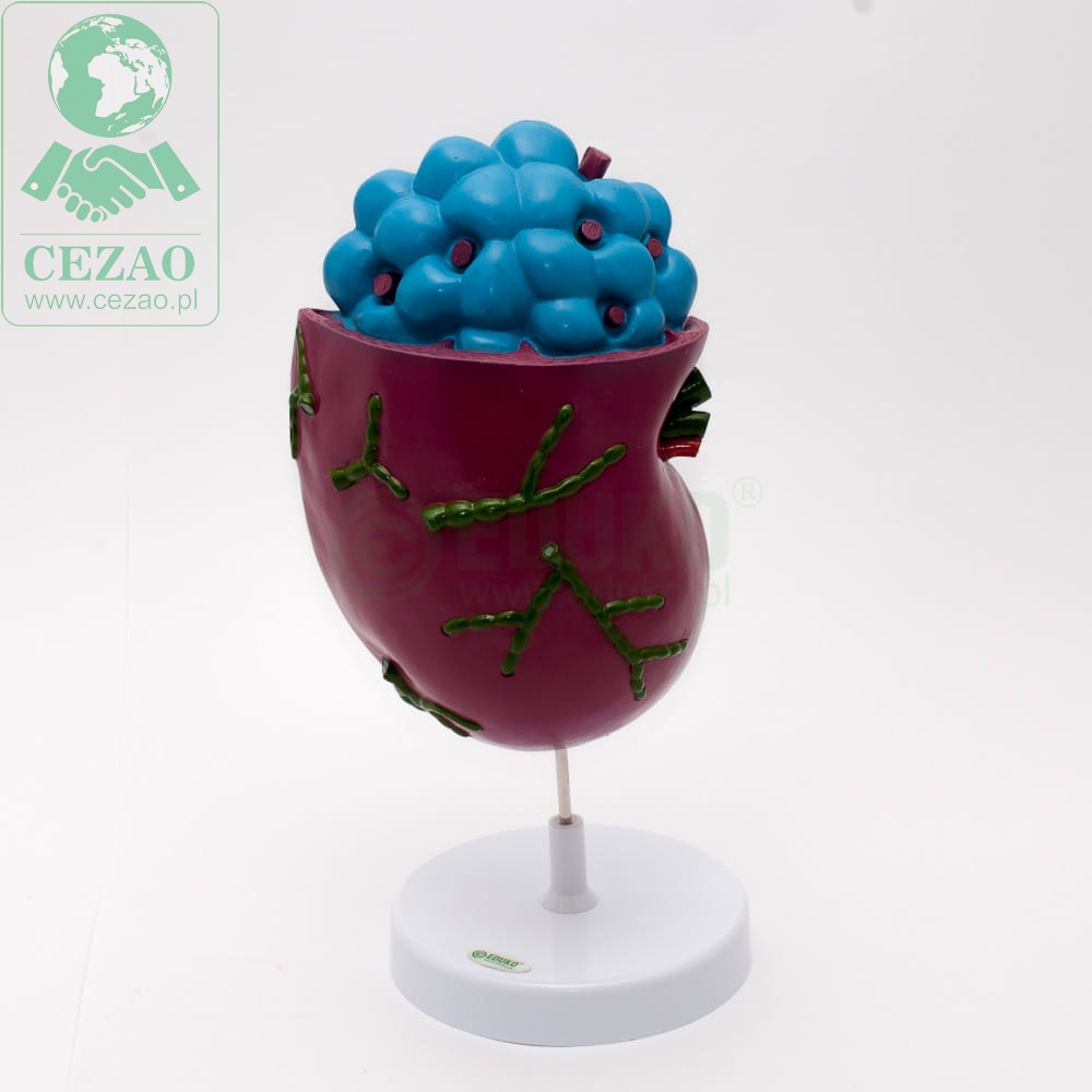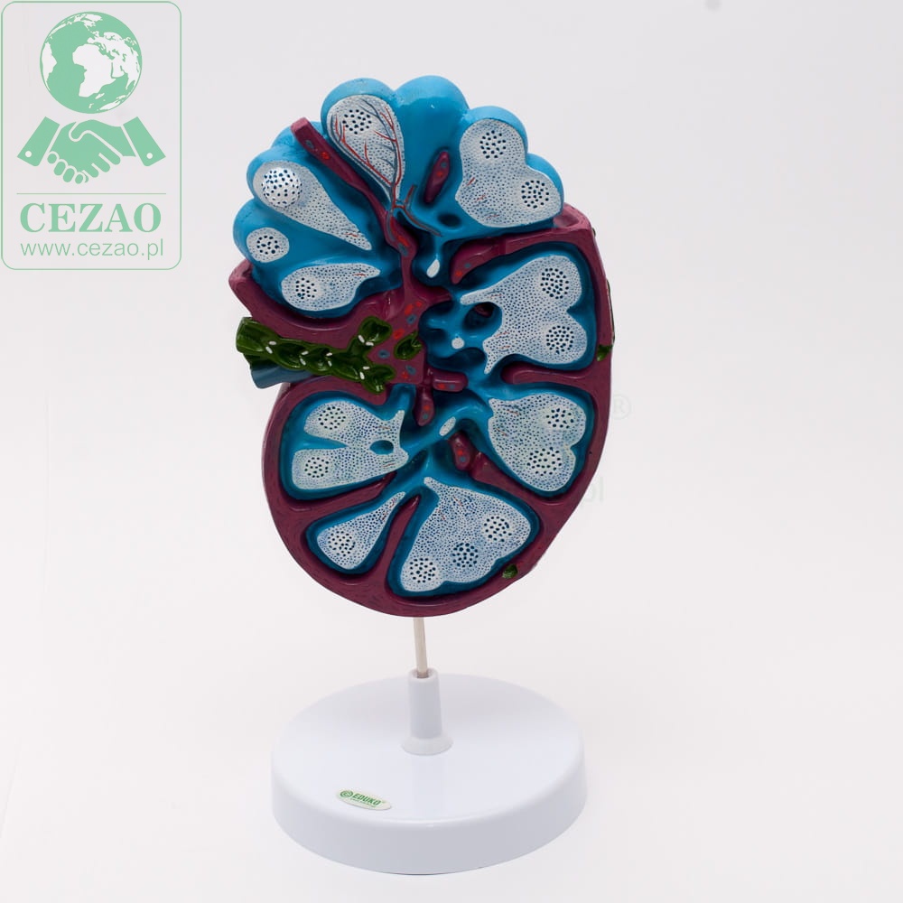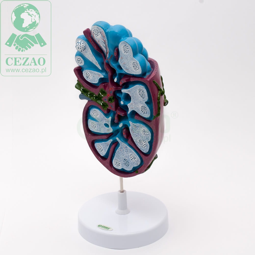 Jednoelementowy model firmy EDUKO o wymiarach 42x20x17cm prezentuje budowę węzłów chłonnych. Na modelu wyraźnie zaprezentowane są szczegóły budowy organu: naczynia chłonne doprowadzające i odprowadzające limfę, żyłki, tętniczki i grudki chłonne. Dzięki tej szczegółowości model doskonale sprawdza się na lekcjach biologii w liceum. Pomoc dydaktyczna została wykonany z wysokiej jakości tworzywa sztucznego.