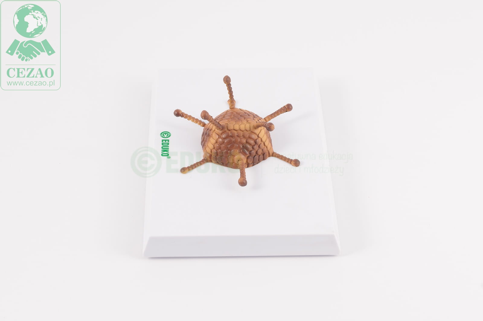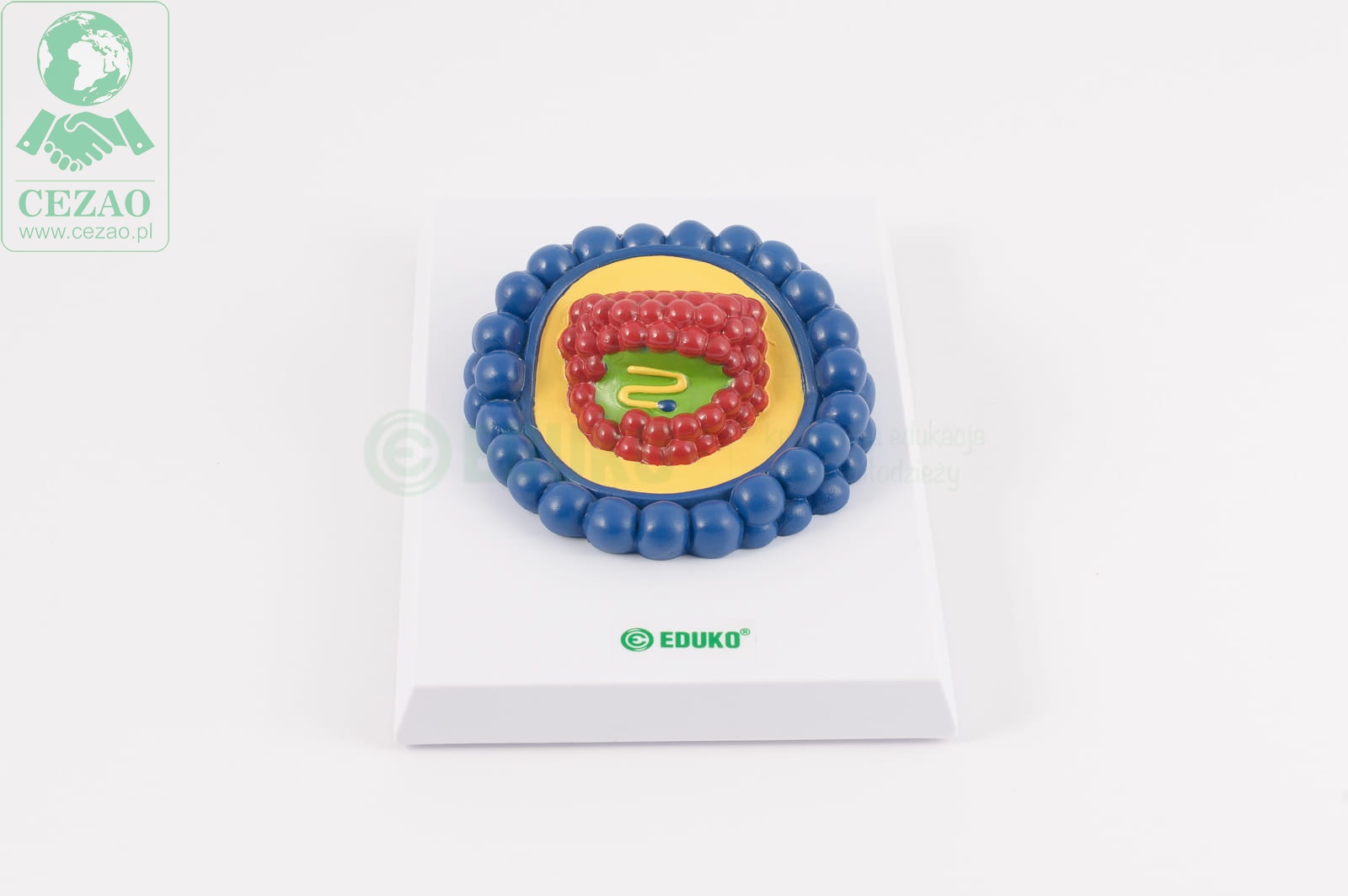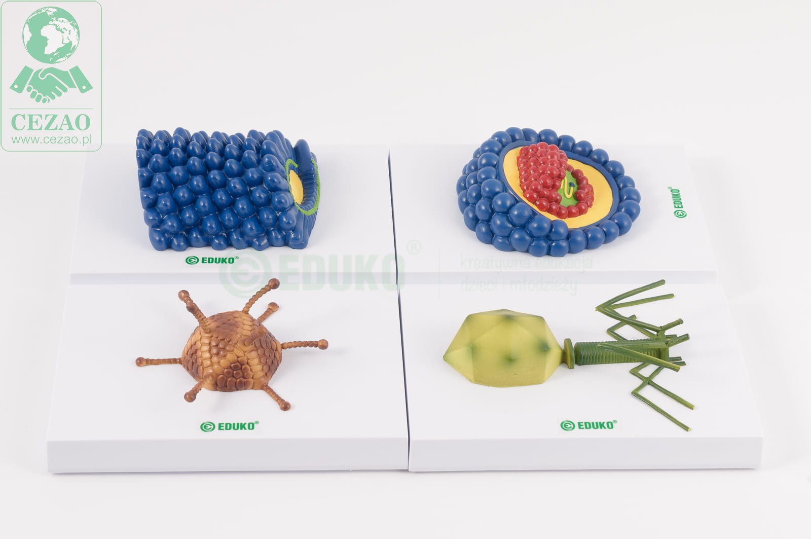 Zestaw 4 niezależnych modeli przestawiających różnorodność kształtów wirusów. W skład zestaw wchodzą modele: wirusa HIV- kolistego, z lipidową otoczką, adenowirusa- o symetrycznej budowie i bez otoczki, bakeriofaga o kapsydzie w ksztacie kojarzonym często z kosmicznymi łazikami- z główką, ogonkiemi czułkami i wirusa mozaiki tytoniu- w białkowej otoczce o o cylindrycznym kształcie.