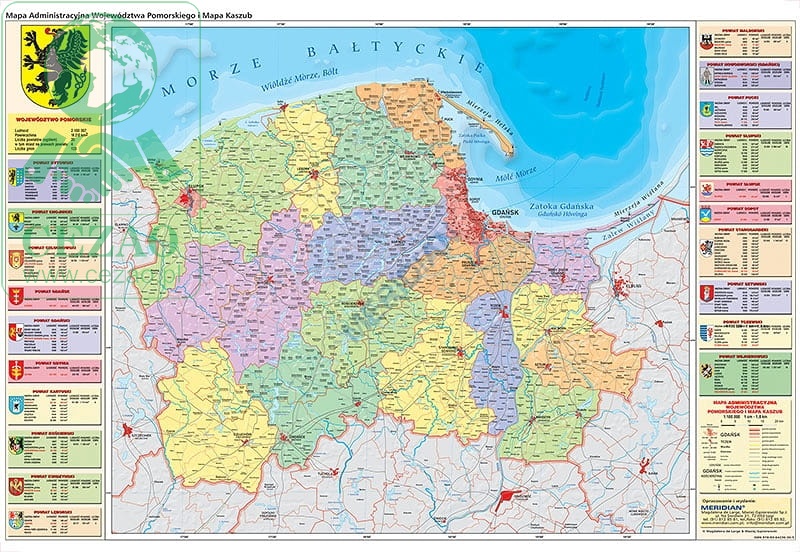 Ścienna mapa szkolna przedstawiająca administracyjny podział województwa pomorskiego wraz z uwzględnieniem sieci dróg, kolei oraz drogowych, morskich i lotniczych przejść granicznych. Dodatkowo w panelach bocznych zawiera informacje, takie jak: powierzchnia, ludność, struktura administracyjna o województwie oraz o poszczególnych powiatach. Ilustrowana herbami. Mapa zawiera kaszubskie nazwy.