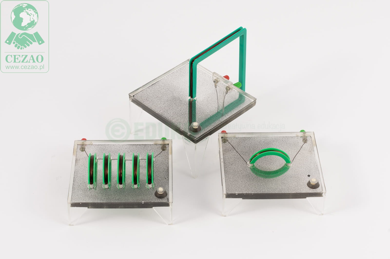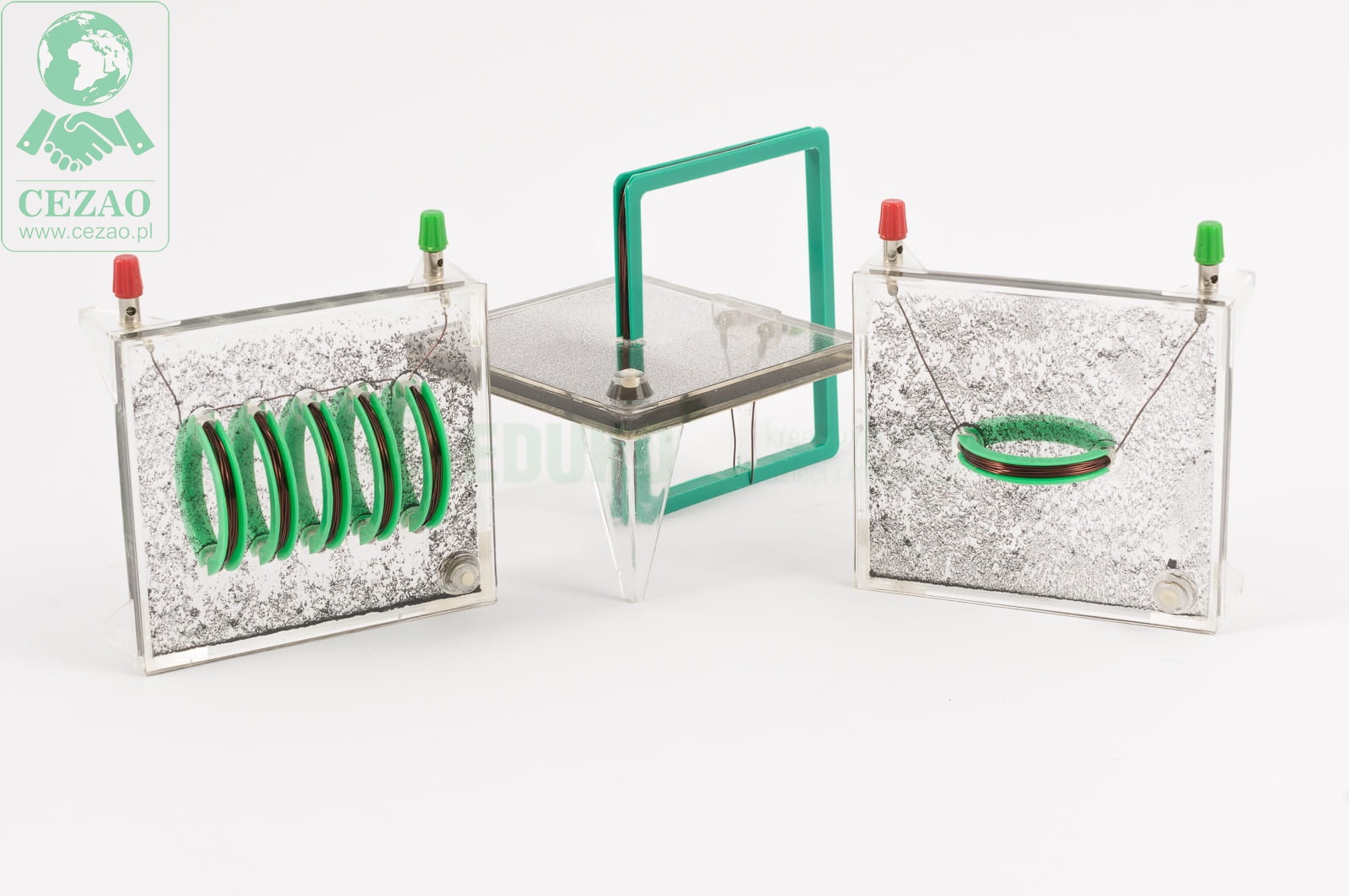 Pomoc dydaktyczna firmy EDUKO pozwala na unaocznienie uczniom przebiegu linii sił pola elektromagnetycznego. Uwięzione między warstwami pleksi opiłki reagują na pole elektromagnetyczne powstałe po przyłożeniu napięcia do zwojnic. Możliwość samodzielnego przeprowadzenia doświadczenia i sprawdzenia na własną rękę zakładanego przez siebie hipotetycznego przebiegu linii sił pola uatrakcyjni lekcję i aktywizuje nawet obojętnych uczniów. W skład zestawu wchodzą 3 przyrządy o różnych kształtach cewki.