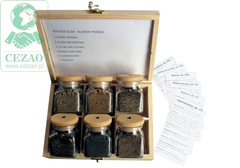 W drewnianej skrzyneczce znajduje się 6 ponumerowanych słoiczków o pojemności 100 ml każdy, zawierających próbki najpopularniejszych gleb występujących w Polsce do której należą niżej wymienione: