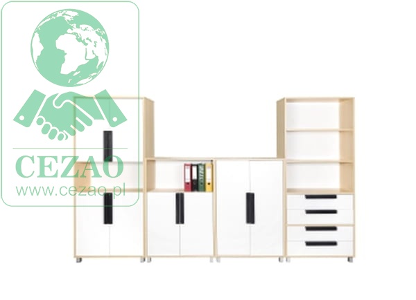 Standardowo regał wyposażono w nóżki o wysokości 60 mm oraz duże drewniane uchyty.