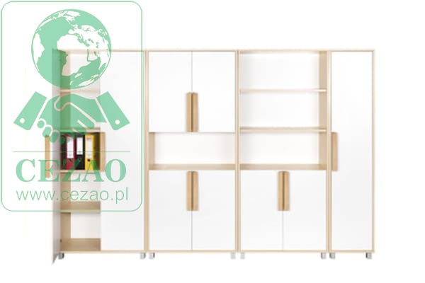 Standardowo regał wyposażono w nóżki o wysokości 60 mm oraz duże drewniane uchyty.