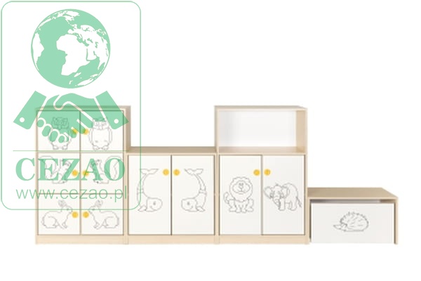 Fronty regału wykonane z białej płyty MDF, ozdobionej frezowanymi motywami zwierząt.