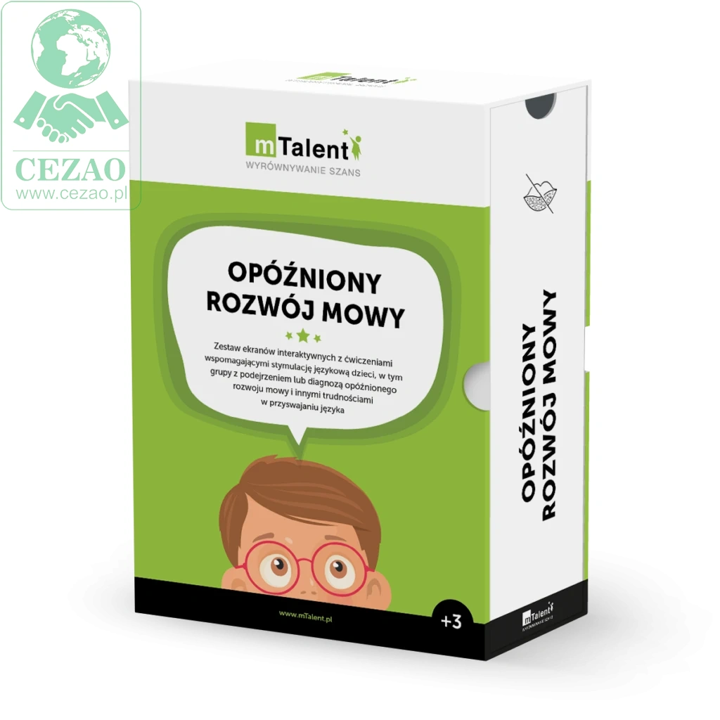Licencja bezterminowa 4 stanowiska Zawartość programu mTalent Opóźniony rozwój mowy Autorskie publikacje (w tym poradnik metodyczny do programu i instrukcja tworzenia własnych zasobów) Ponad 800 ekranów interaktywnych i obszerna baza kart pracy do wydruku Książka z wierszykami opartymi na onomatopejach „PIĘĆDZIESIĄT WIERSZYKÓW (w nich dźwięków bez liku)” Talia kart „Co jem? Co kupuję? Czym częstuję?” do treningu sytuacyjnego użycia języka oraz nauki odmiany przez przypadki Zestaw tradycyjnych materiałów edukacyjnych uzupełniających multimedialne ćwiczenia w tym pacynki do odgrywania scenek, zestaw do zabawy w karmienie (lala, miś, butelka, kubek, sztućce) oraz zestaw mebli Bezpłatne szkolenie zakończone wystawieniem certyfikatu Dostęp do centrum wsparcia technicznego i szkoleniowego mTalent Bezpłatne aktualizacje programu mTalent Opóźniony rozwój mowy to: szczególnie wartościowy zestaw dla dzieci przejawiających opóźnienia w rozwoju mowy lub trudności w przyswajaniu języka, ćwiczenia wspomagające naukę języka polskiego młodszych dzieci z doświadczeniem migracji, ponad 15 autorskich tekstów kształtujących umiejętność rozumienia mowy, ćwiczenia interaktywne na dwóch poziomach (dostosowane do dwóch grup wiekowych), zestaw materiałów dodatkowych (poradnik metodyczny dla prowadzących zajęcia i pomoce tradycyjne do zajęć „stolikowych”), gotowe scenariusze zajęć z pomysłami na to, jak wykorzystać materiały dołączone do programu i urozmaicić w ten sposób terapię, materiał z kilkustopniowym systemem motywacyjnym, praca na monitorze lub tablicy interaktywnej, komputerze, laptopie, tablecie lub innym urządzeniu multimedialnym.